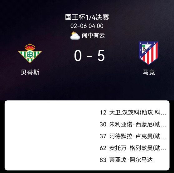 北京时间2月6日西班牙国王杯1/4决赛,贝蒂斯对阵马竞。第12分钟汉茨科破门0-1;第30分钟小西蒙尼破门0-2;第38分钟卢克曼破门0-3;第62分钟格列兹曼破门0-4;第83分钟阿尔马达破门0-5;双方无红黄牌。最终比分,皇家贝蒂斯0-5马德里竞技。