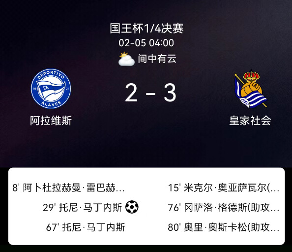 北京时间2月5日西班牙国王杯1/4决赛,阿拉维斯对阵皇家社会。第8分钟雷巴赫破门1-0;第15分钟奥亚萨瓦尔破门1-1;第29分钟马丁内斯点射2-1;第76分钟格德斯破门2-2;第80分钟奥斯卡松破门2-3;双方无红黄牌。最终比分,阿拉维斯2-3皇家社会。