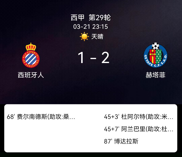 北京时间3月22日01:25,西班牙足球甲级联赛第29轮,西班牙人主场迎战赫塔费。上半场双方僵持许久,补时阶段赫塔费突然发力,第3分钟米利亚助攻多明戈斯-杜阿尔特破门首开纪录,仅4分钟后杜阿尔特再送助攻,阿兰巴里破门扩大比分,赫塔费带着两球优势进入中场休息。下半场第68分钟,鲁文-桑切斯助攻罗伯托-费尔南德斯破门,西班牙人扳回一城。比赛尾声赫塔费主帅博尔达拉斯被红牌罚下,主队全力反扑却未能再度破门。最终西班牙人主场1-2不敌赫塔费,赫塔费客场拿下三分。