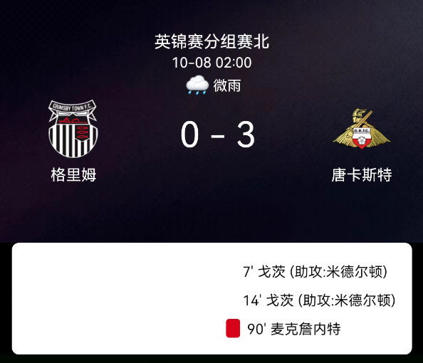 北京时间10月8日,英格兰联赛锦标赛小组赛北区,格里姆主场迎战唐卡斯特。第7分钟米德尔顿送出首助,戈特斯破门助唐卡斯特1-0领先;第12分钟格里姆球员因拼抢犯规领得本场首张黄牌,第14分钟米德尔顿再送助攻,戈特斯梅开二度扩大比分;下半场第68分钟唐卡斯特球员战术犯规染黄,第90分钟格里姆麦克詹内特自摆乌龙,最终比分,格里姆0-3唐卡斯特。