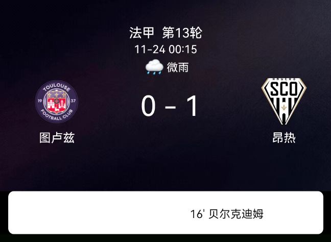 北京时间11月24日,法国足球甲级联赛第13轮,图卢兹主场对阵昂热。第16分钟贝尔克迪姆破门,0-1;双方无红黄牌。最终比分,图卢兹0-1昂热。